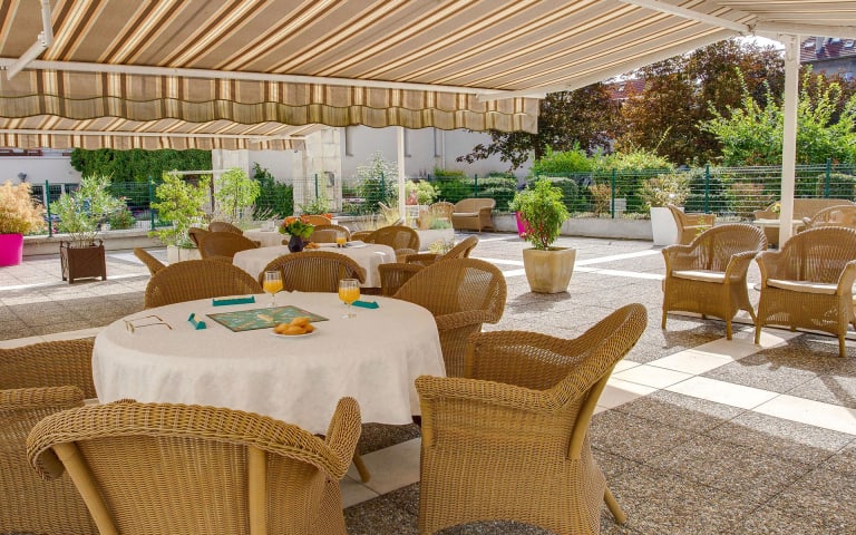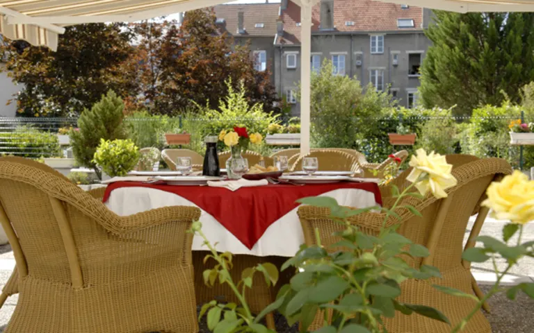 Sa grande terrasse et sa situation en retrait des voies passantes permettent de profiter de la vie urbaine tout en étant protégé de l’agitationLire plus citadine.